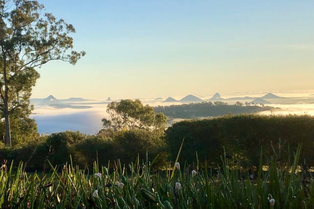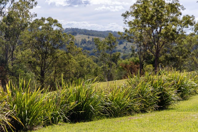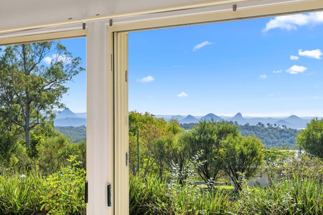 Perched on a corner allotment that has well-maintained play-friendly lawns, landscaped gardens, established fruit trees, raised veggie beds and native areas that welcome visiting wildlife and birdlife, the home's orientation grants plenty of privacy together with a predominantly glass-featured northeastern aspect that allows far-reaching views of the Sunshine Coast Hinterland towards the ocean.
